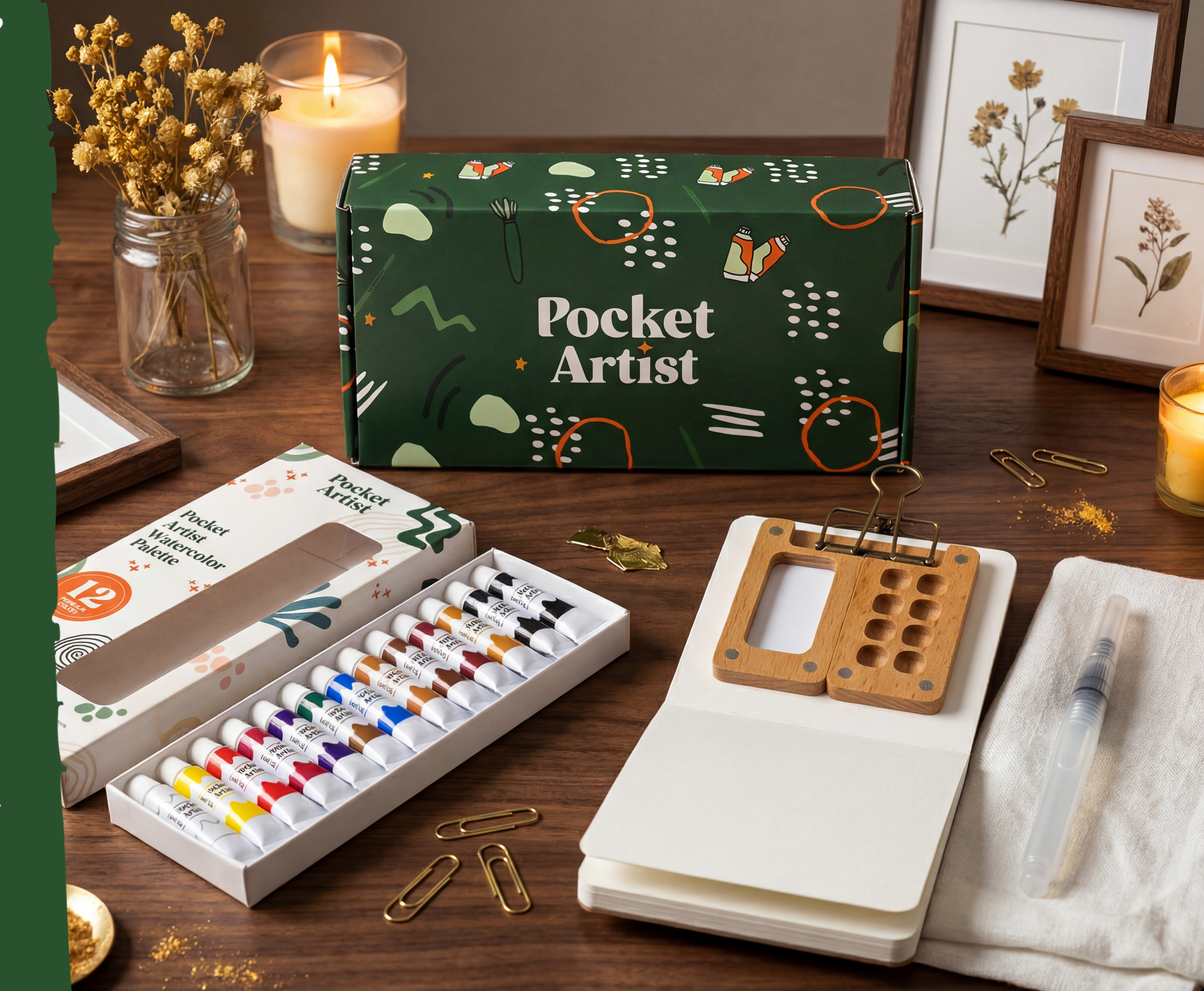 You're on the train. Waiting at pickup. Sitting in a café. Inspiration strikes, but your supplies are at home. Pocket Artist changes that. A complete watercolor kit that fits in your bag. Perfect for travelling.